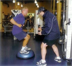 Fit and trim. Working with a keelboat trimmer, Legum starts with core exercises and then focuses on specific muscles. “I place clients in positions similar to those used on big boats and then work those muscles in a way that mirrors working the boat-knees bent, bending at the waist,” he explains. “The exercises I use-chest fly, seated one-arm row, standing row on a Bosu ball-would be followed by a fast-twitch muscle exercise, such as a squat thrust. Then I would have the client rest, then explode to duplicate tacking.”